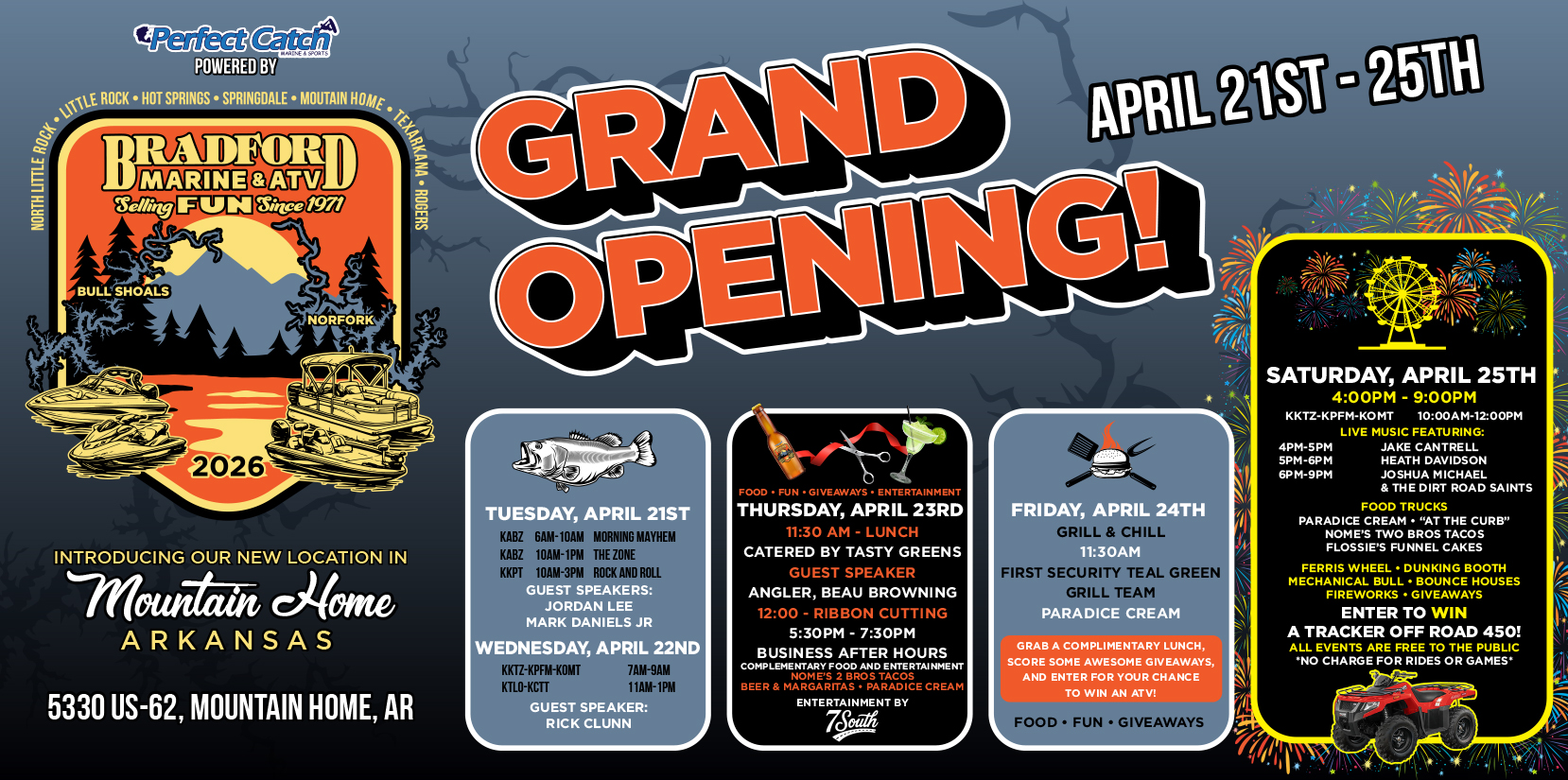 Bradford Marine & ATV, established in 1971, is here to serve all of your boating and ATV needs! We have 7 locations to serve you—six in Arkansas and one in Texas. Our large showrooms allow you to find the boat or ATV of your dreams!