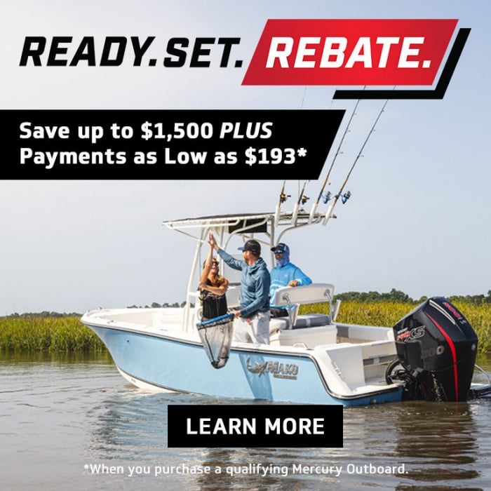 Upgrade your boat’s outboard for less this fall with the Mercury Ready. Set. Rebate. offer. Now through November 30, 2025, you can get up to $1,500 off the purchase price when you buy a new Mercury 30-425hp outboard for your existing boat. Plus, you can finance your purchase for as low as $193 monthly.