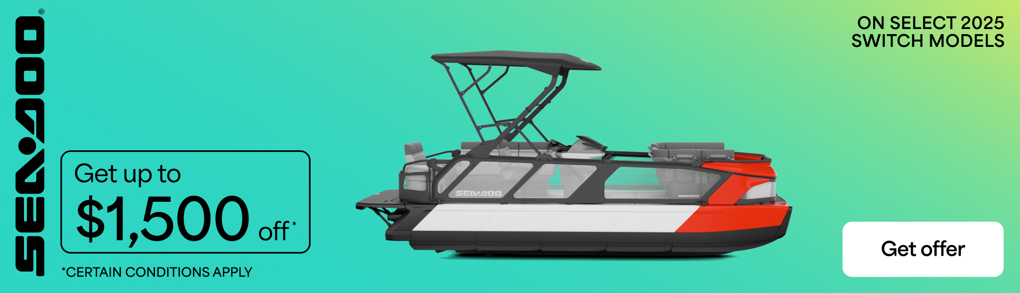 † Rebate up to $1,500 on 2025 Sea-Doo Switch models: Consumers who purchase a 2025 Switch 18', 19' or 21' are eligible to a $1,500 rebate. Consumers who purchase a 2025 Switch 13' or 16' are eligible to a $1,000 rebate.