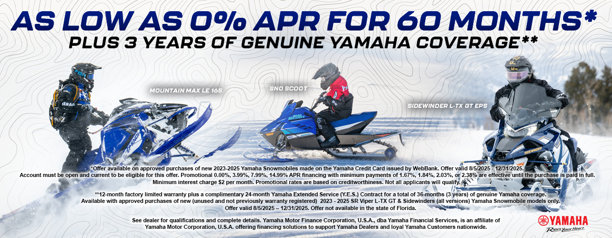 *Offer available on approved purchases of new 2024-2025 Yamaha Snowmobiles made on the Yamaha Credit Card issued by WebBank. Offer valid 1/1/2026 - 3/31/2026. Account must be open and current to be eligible for this offer. Promotional 0.00%, 3.99%, 7.99%, 14.99% APR financing with minimum payments of 1.67%, 1.84%, 2.03%, or 2.38% are effective until the purchase is paid in full. Minimum interest charge $2 per month. Promotional rates are based on creditworthiness. Not all applicants will qualify.